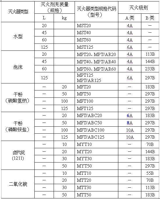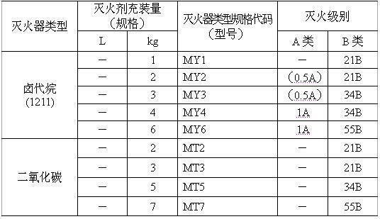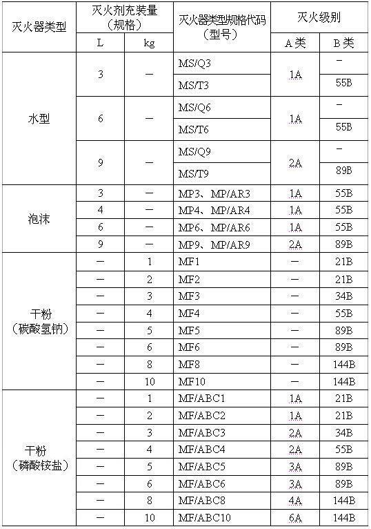 表A.0.1 手提式灭火器类型、规格和灭火级别