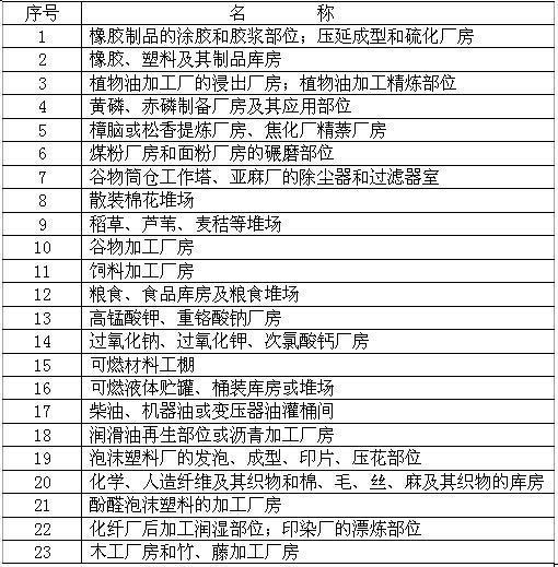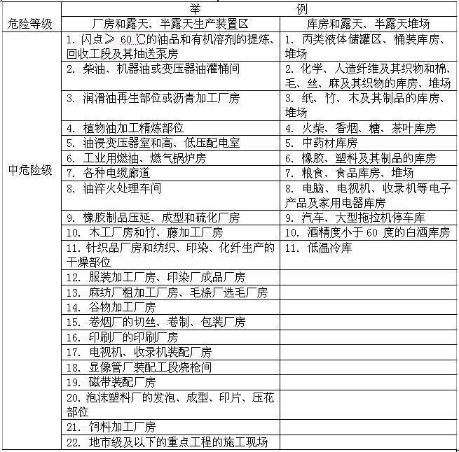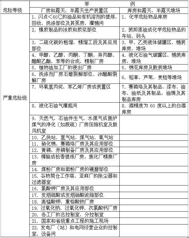 1 严重危险级:火灾危险性大,可燃物多,起火后蔓延迅速,扑救困难,容易造成重大财产损失的场所;