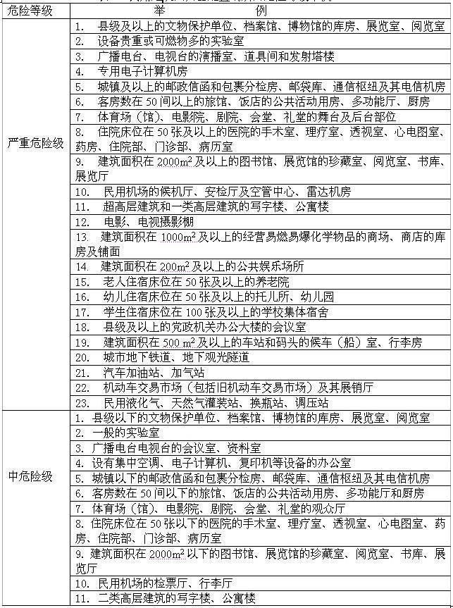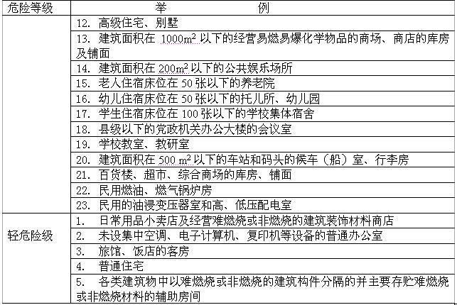 1 严重危险级:使用性质重要,人员密集,用电用火多,可燃物多,起火后蔓延迅速,扑救困难,容易造成重大财产损失或人员群死群伤的场所;