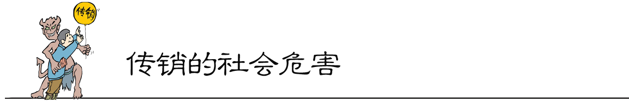 2、严重影响社会的安全稳定。满足传销者的要求,是传销组织竭力颂扬的成功。但是在金字塔式的传销体系中,人人都能成功是根本无法实现的,只有极少数接近塔尖的人才能一夜暴富。而对无数深埋塔底的人来说,被激发的成功理念绝对难以实现,有的变成了真正意义上的穷光蛋。因此,传销活动的这种隐蔽性、欺骗性、流动性和群体性,以及它特有的这种营销方式和组织形式,使之极易演变成有组织的社会犯罪,扰乱社会秩序,导致社会不安定。