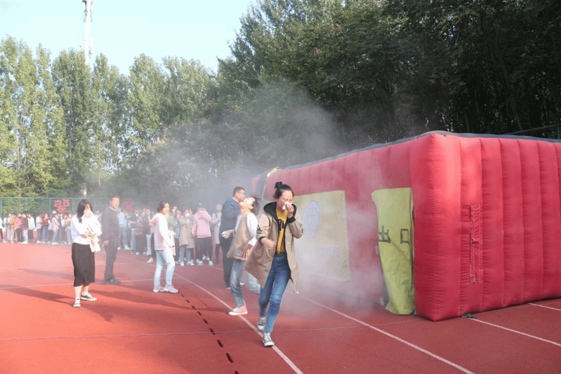 第二,火场逃生实地演练。保卫部(处)工作人员引导学生在火场逃生棚内,弯着腰、猫着步,用手帕、毛巾等捂住口鼻,沿着指定的疏散通道快速前进,有序撤离到安全地带。