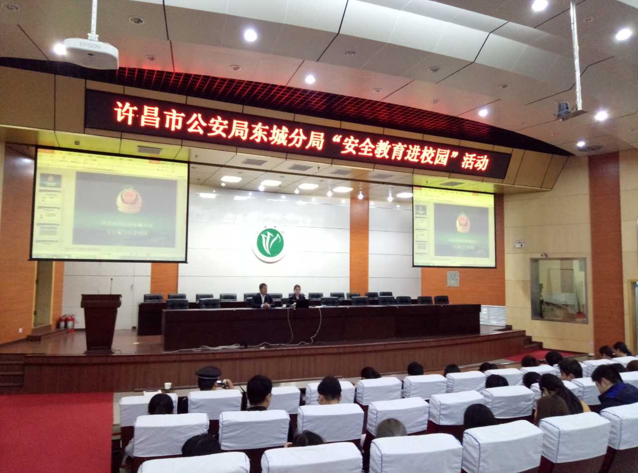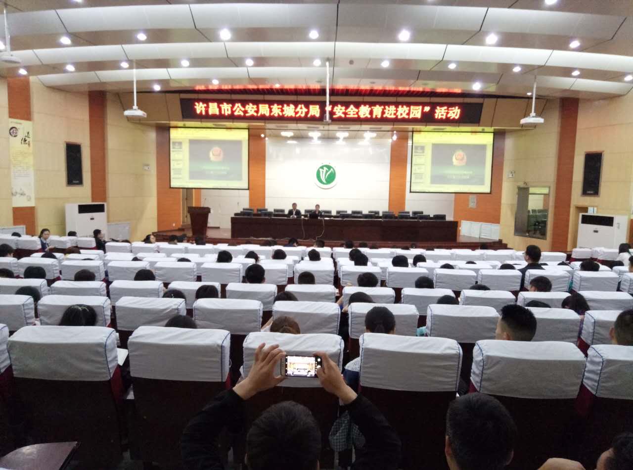 为增强我校大学生安全防范意识,提高防电信诈骗、防火、防盗的能力。2017年5月3日下午,学校保卫处邀请许昌市公安局东城分局民警程玉琪,在我校学术报告厅开展了“安全教育进校园”活动的宣讲。各学院辅导员和学生代表400余人参加会议,会议由保卫处长张谦智主持。