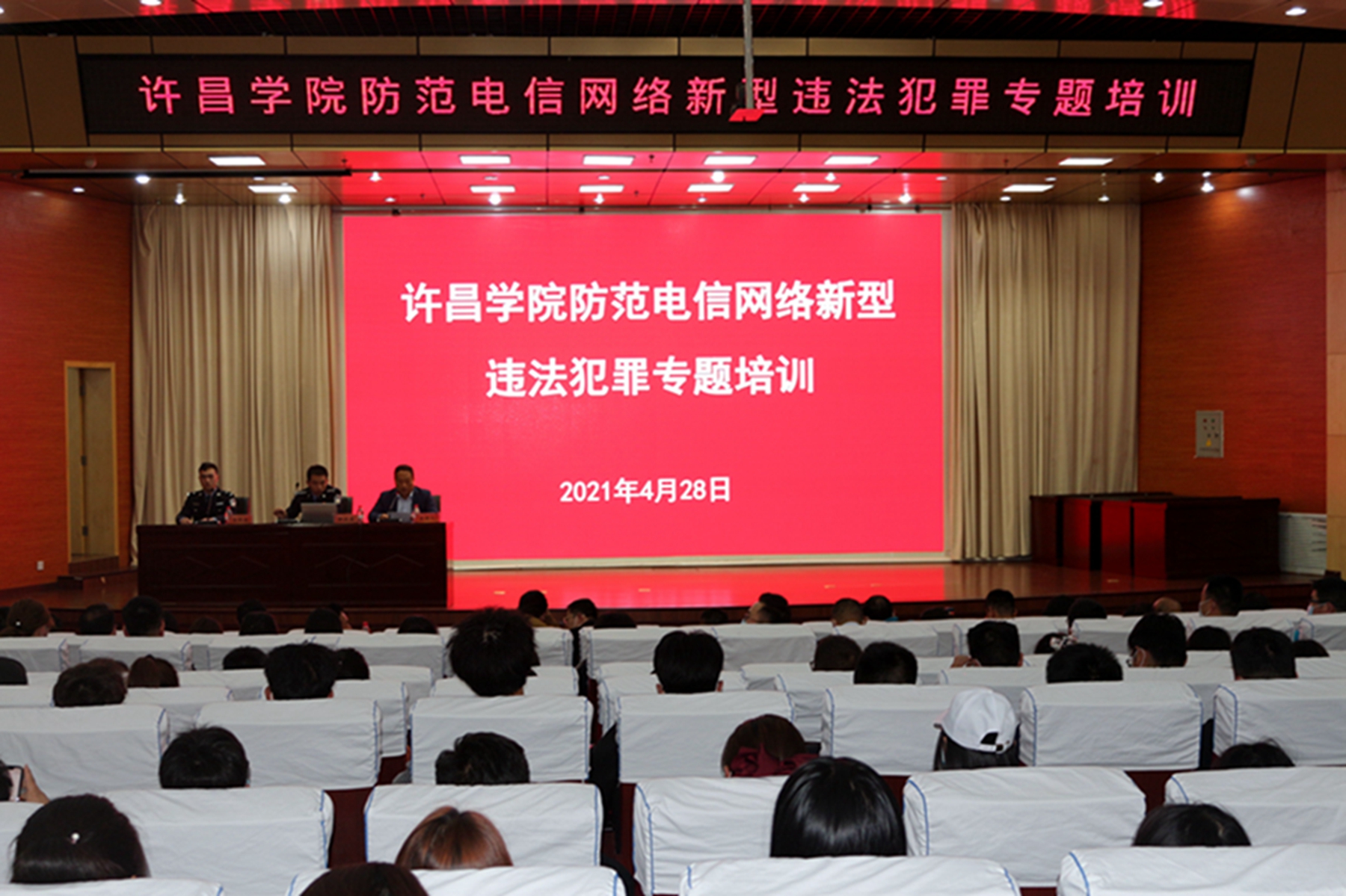 4月28日下午,我校在图书馆学术报告厅举办防范电信网络新型违法犯罪专题培训会,会议特邀许昌市公安局反诈中心副大队长押晓磊,警官李铎政做专题培训。保卫处、学生工作处、校团委相关负责同志,校属各单位师生代表300余人参加培训,培训会由保卫处处长周银超主持。