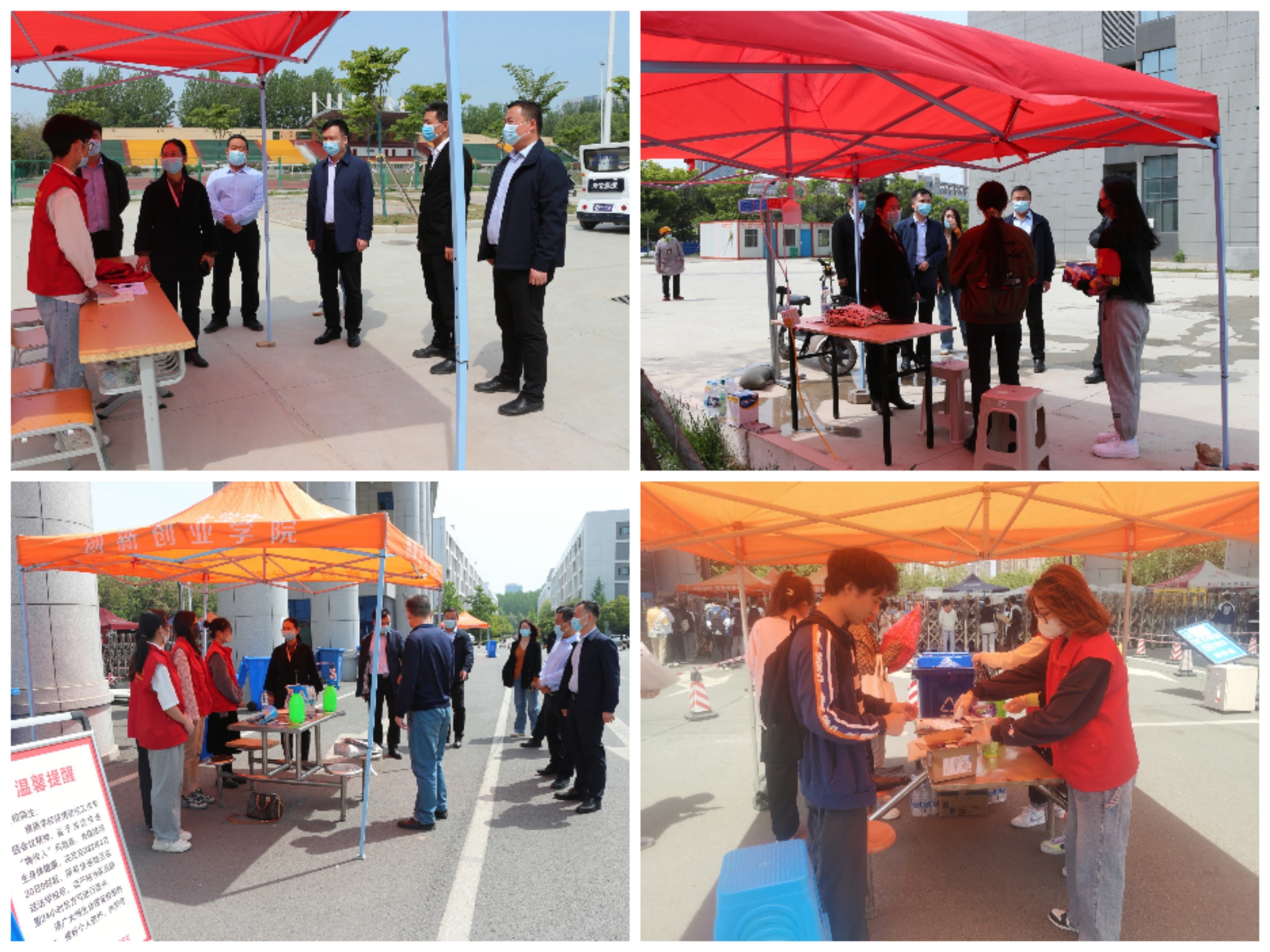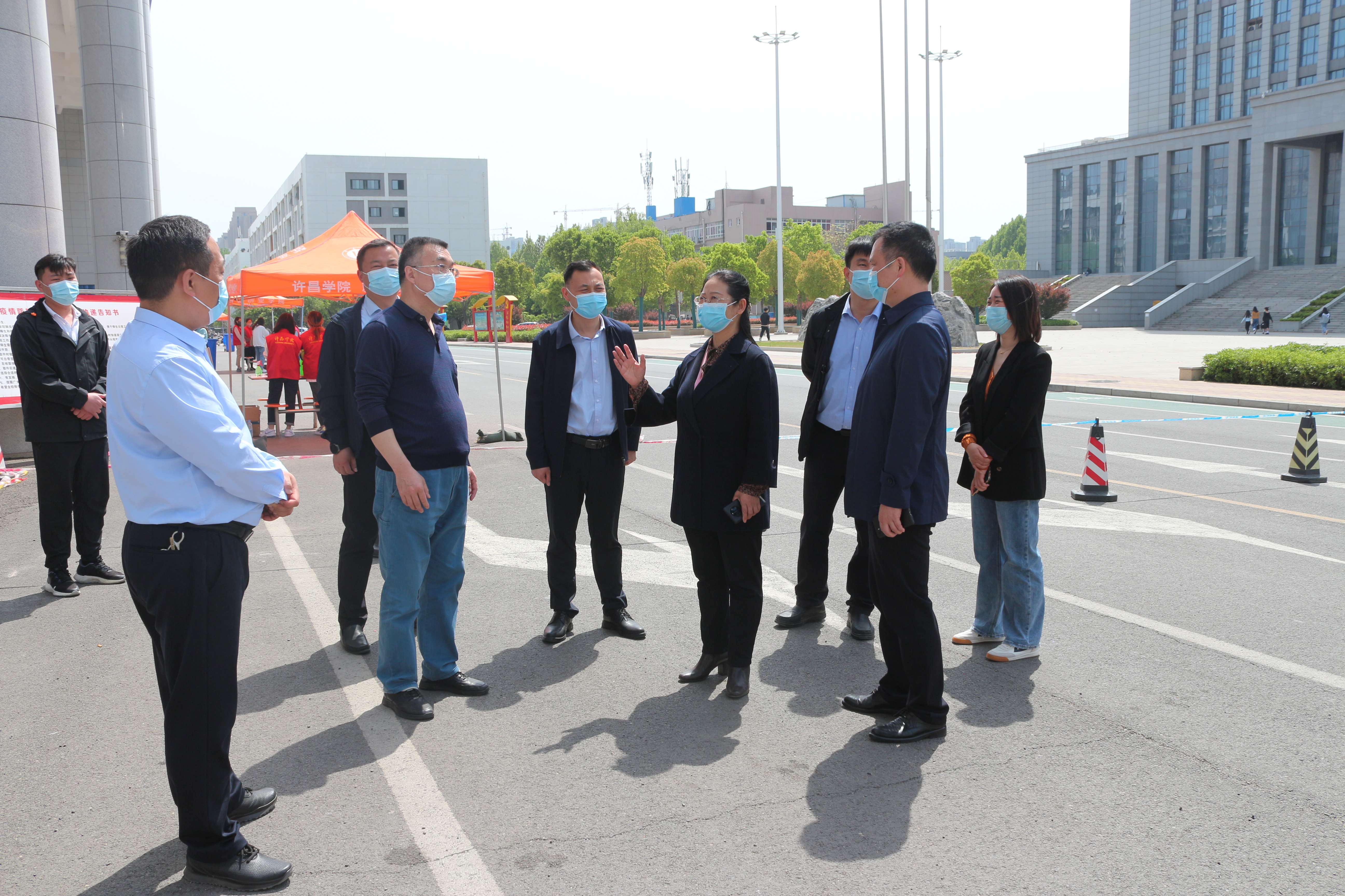 2022年4月20日上午,阳光明媚、春意盎然,副院长潘春彩在机关党委、院长办公室、学生处、保卫处、校团委等部门负责同志的陪同下,实地调研校园疫情防控文明劝导岗、快递包裹领取点等校园新冠疫情管控文明劝导及快递包裹消杀工作,并慰问了在校园文明劝导岗和快递领取点执勤的志愿者。