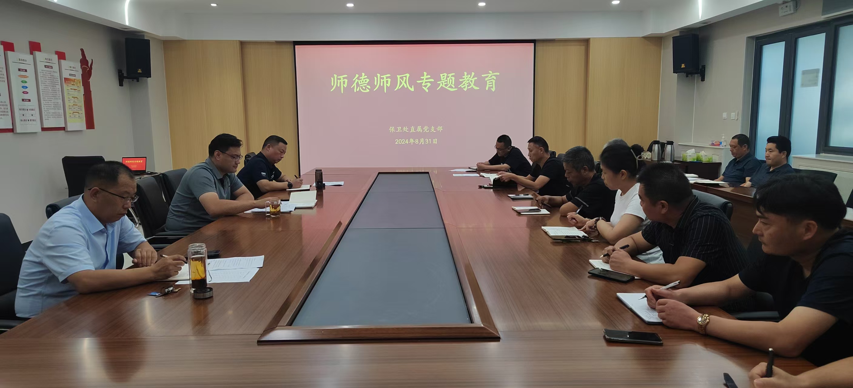 8月31日,保卫处直属党支部在二楼会议室召开师德师风专题会议。支部书记李想、处长陈浩勇,副处长邓朝璞,保卫处全体人员参加。会议由李想主持。