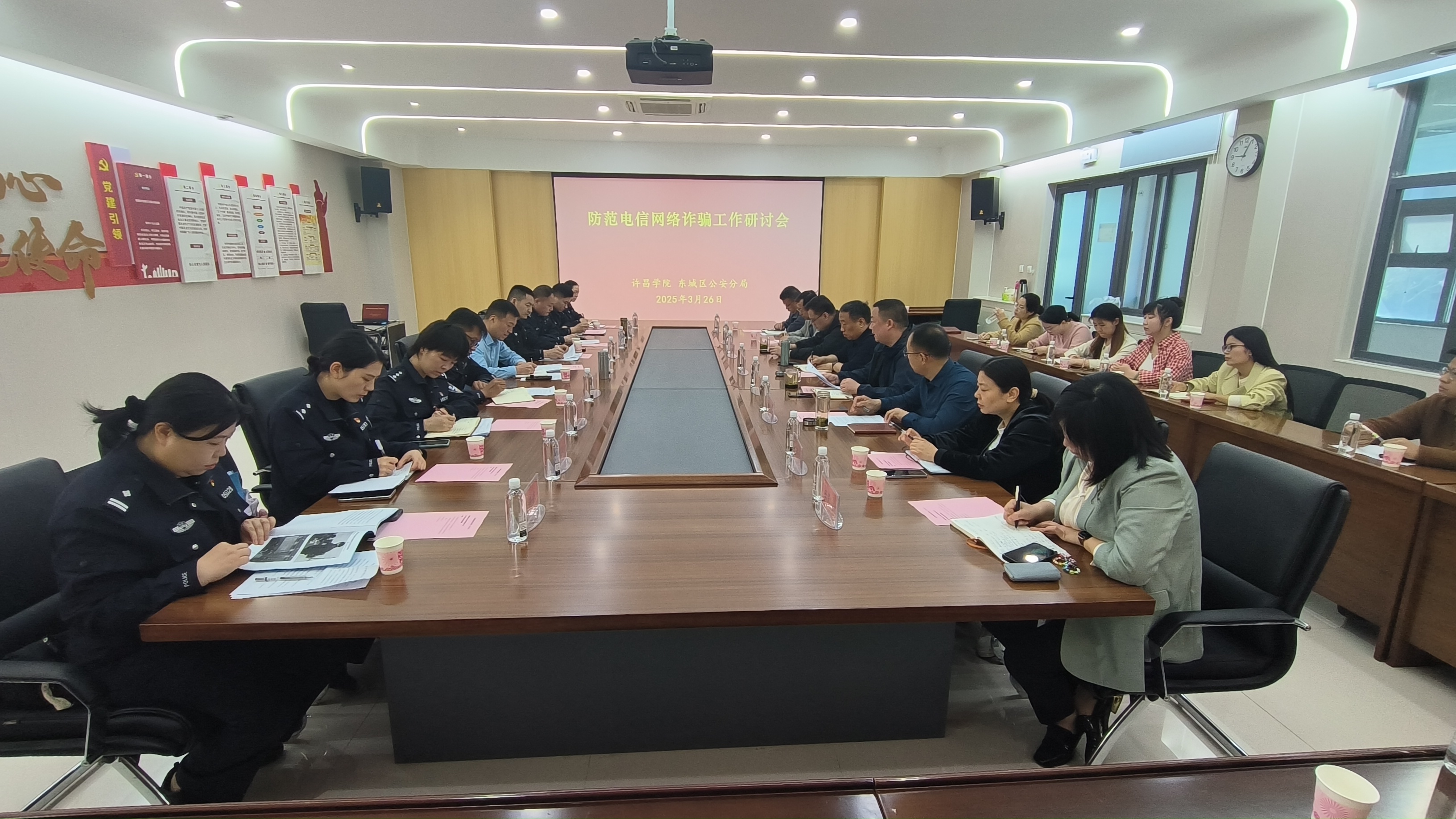 为有效应对电信网络诈骗对校园安全带来的严峻形势,切实保障师生财产安全。3月26日上午,东城公安分局党委书记、局长魏俊峰一行8人到我校召开反诈工作专题联席会议。我校保卫处直属党支部书记李想、处长陈浩勇,学生处处长周银超,二级学院党委副书记代表、辅导员以及学生代表参加座谈会。会议由保卫处副处长邓朝璞主持。